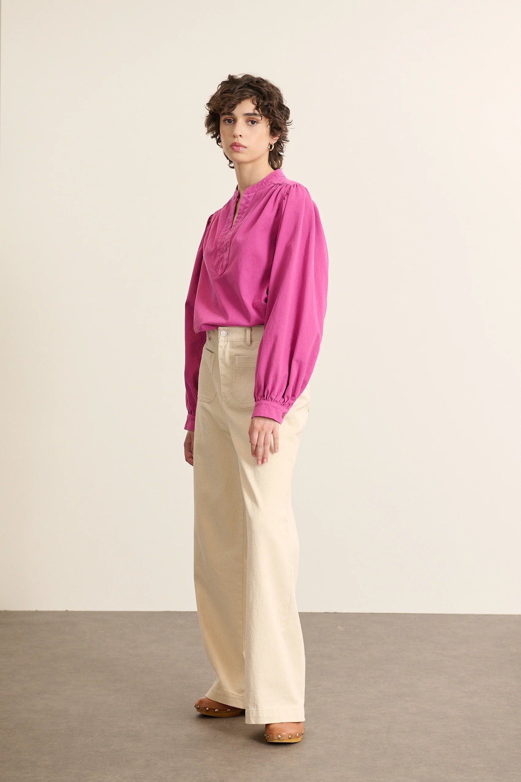 BEA est une blouse ample en toile sergé, conçue pour allier confort et style. Ses découpes devant et dos, soulignées par des fronces délicates, apportent légèreté et mouvement à la silhouette. Sa teinte fuchsia éclatante donne une touche de fraîcheur et de dynamisme, parfaite pour un look de jour.