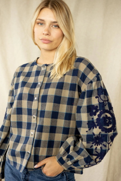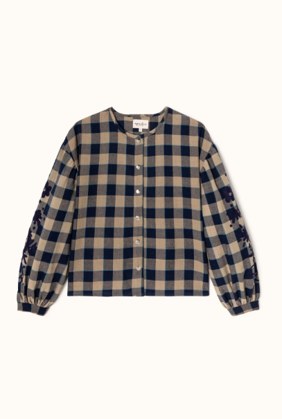 La chemise BINU réinvente l’intemporel motif à carreaux avec une note féminine et raffinée. Confectionnée en coton khadi, elle se distingue par ses broderies délicates sur les manches et sa patte de boutonnage à pressions qui mêle confort et élégance. Ses manches légèrement froncées ajoutent une touche de style unique à vos tenues quotidiennes.