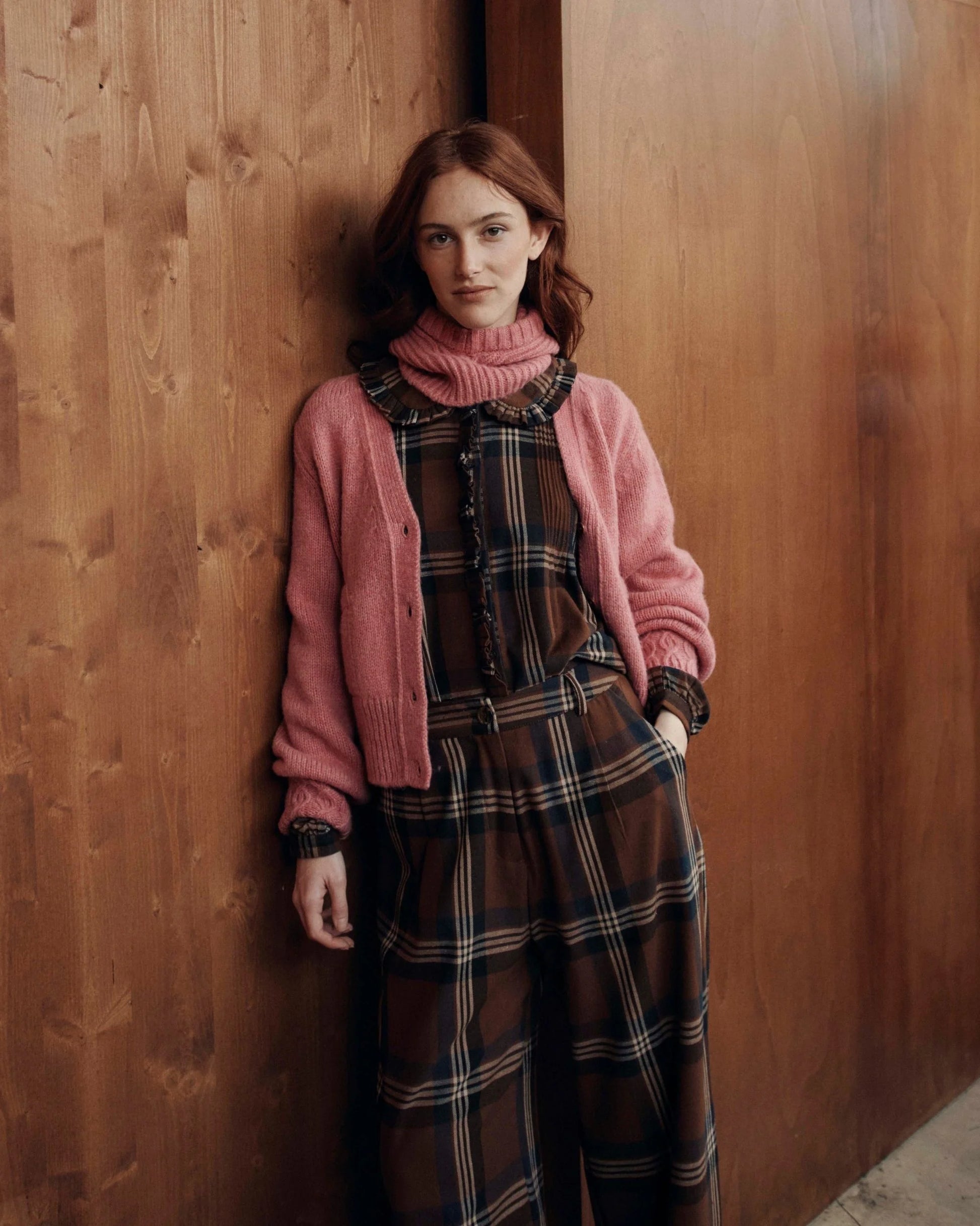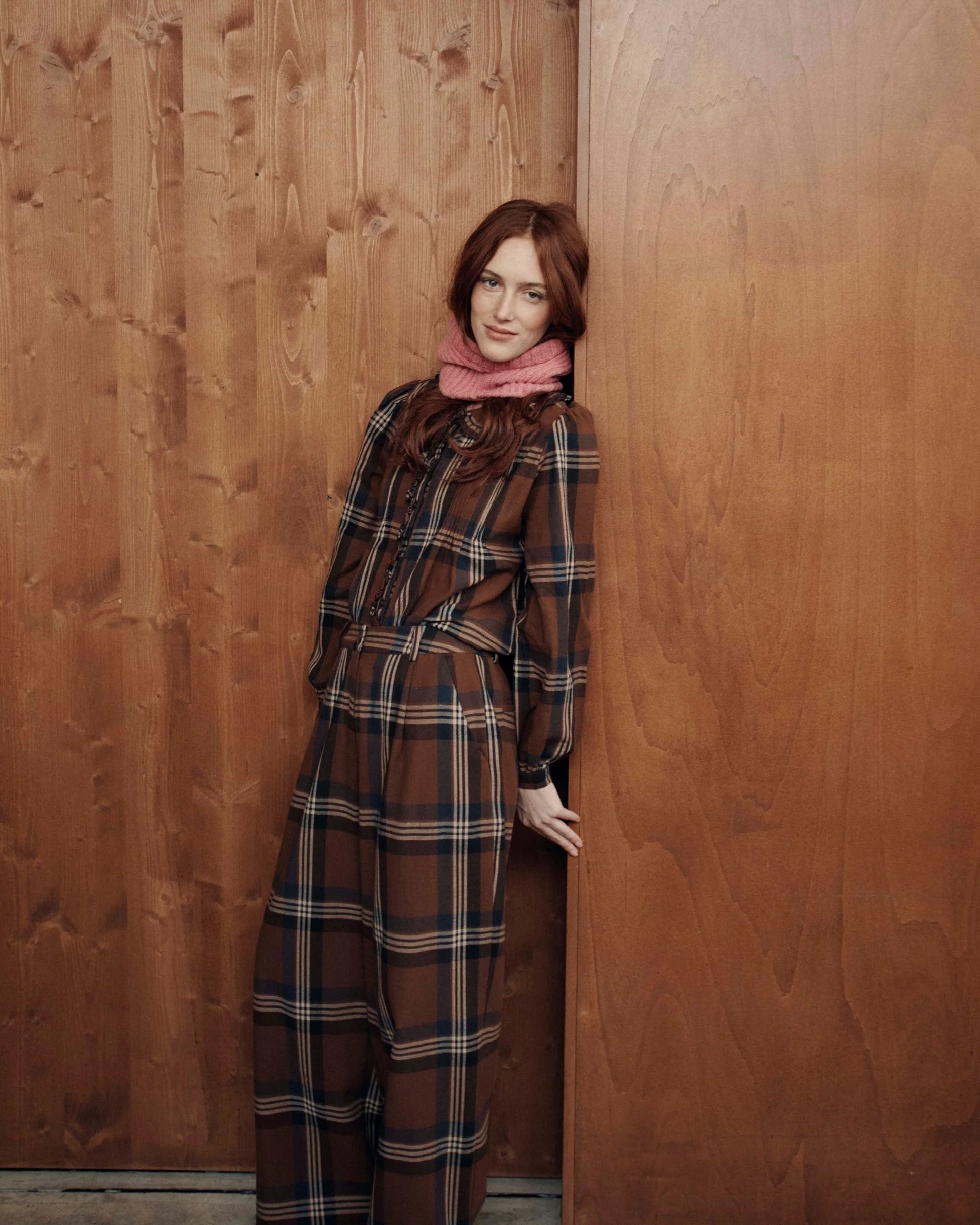 Blouse en coton marron quadrillée de lignes blanches et noires.
