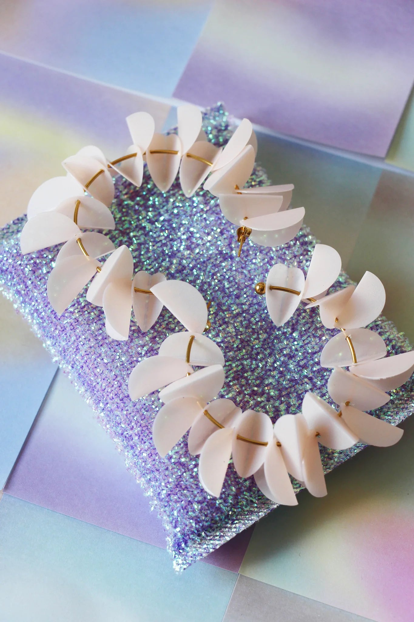 Description : sequins pliés et percés à la main. Ils sont glissés à même la créole. Deux types de perçage ont été appliqués aux sequins : au milieu et en haut de la pliure. L'alternance de ces sequins confère le volume si particulier à ce modèle.