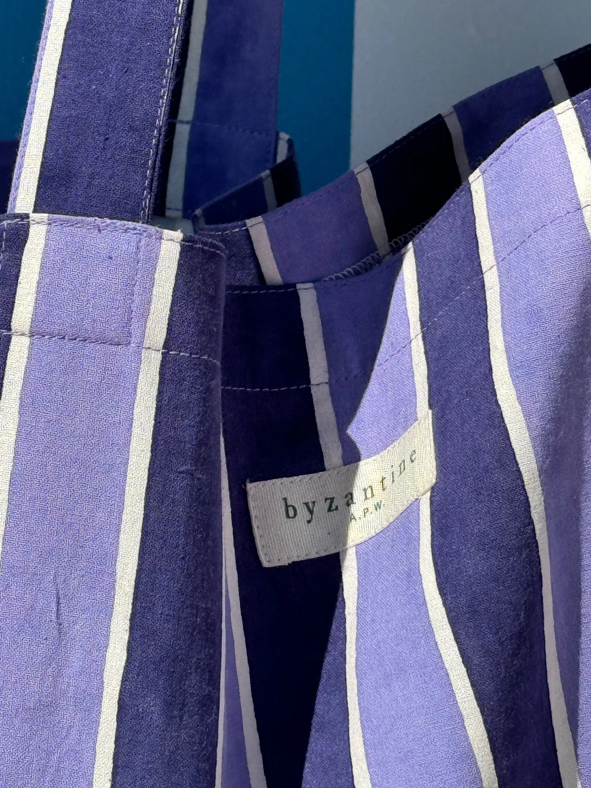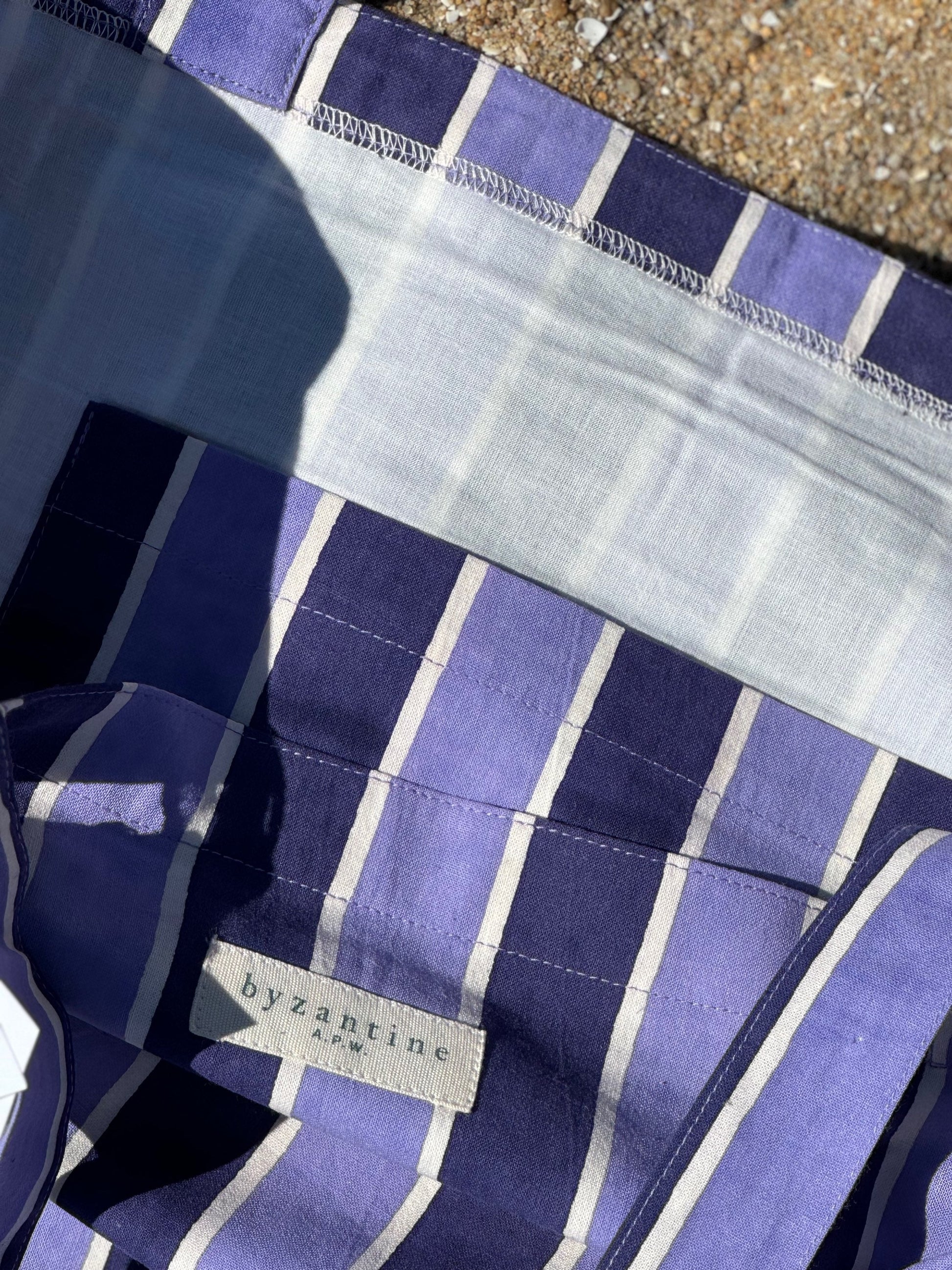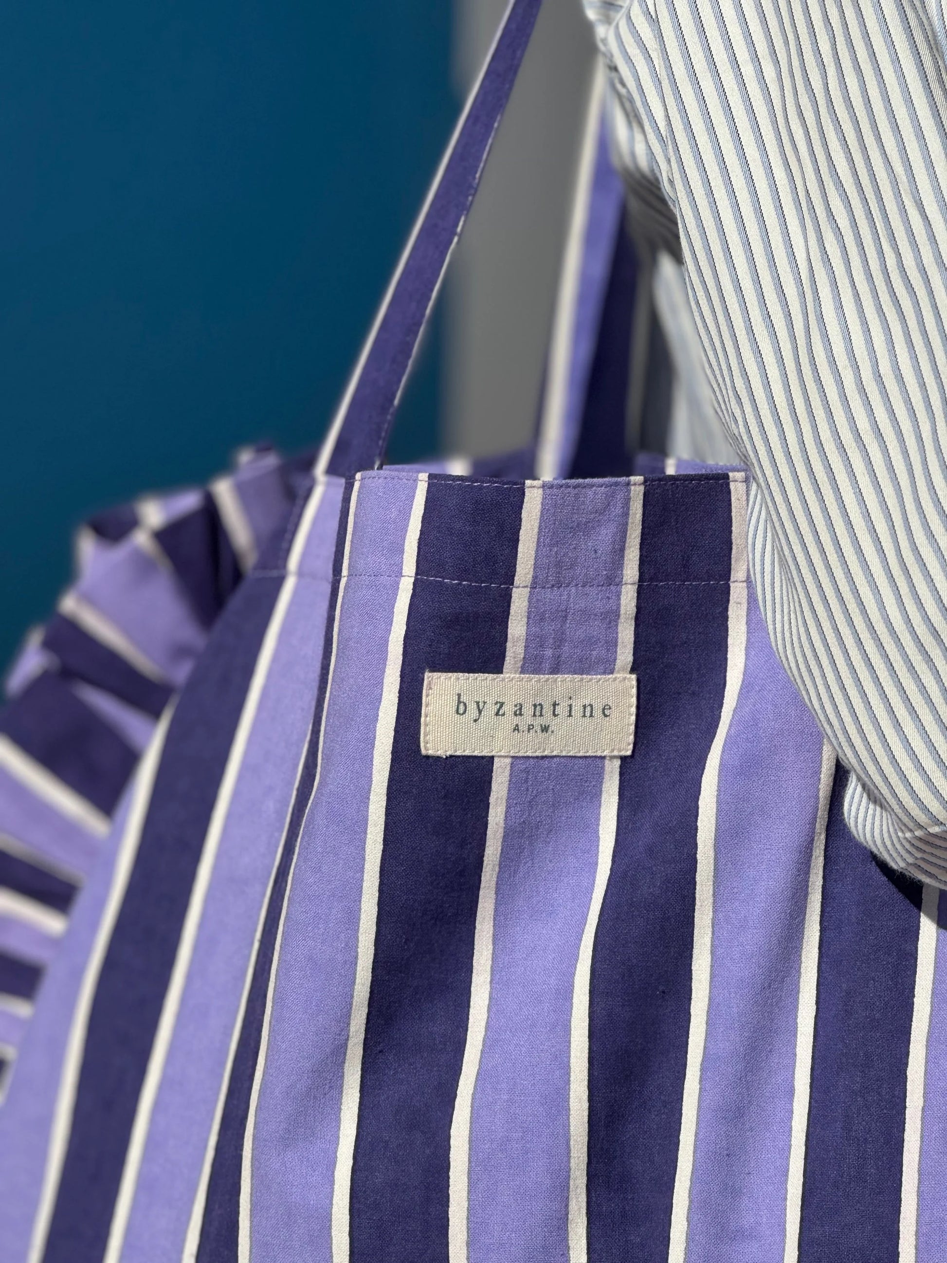 Avec sa grande contenance et ses adorables froufrous, ce sac a été pensé pour vous accompagner partout au quotidien : courses, escapades, plage, week-ends. Il apportera une touche de fun à votre look. Il existe 2 modèles de sac Froufrou : rayé lavande et damier moutarde violet