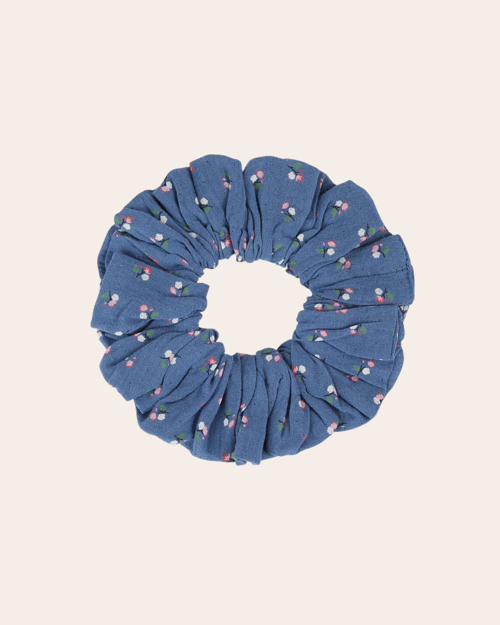 Chouchou en coton bio bleu imprimé de mini fleurs en all-over. Dans les cheveux, ou en bracelet autour du poignet, voilà un chouchou à assortir avec la robe ou la blouse.
