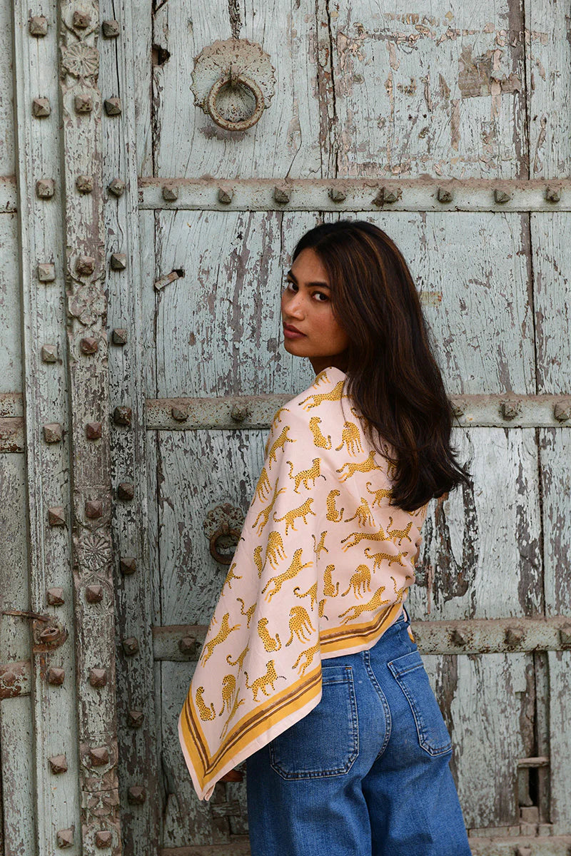 Cet foulard a été imprimé de manière artisanale selon la technique d'impression blockprint et confectionné à Jaipur en Inde. Les couleurs sont réalisées à partir de pigments naturels.