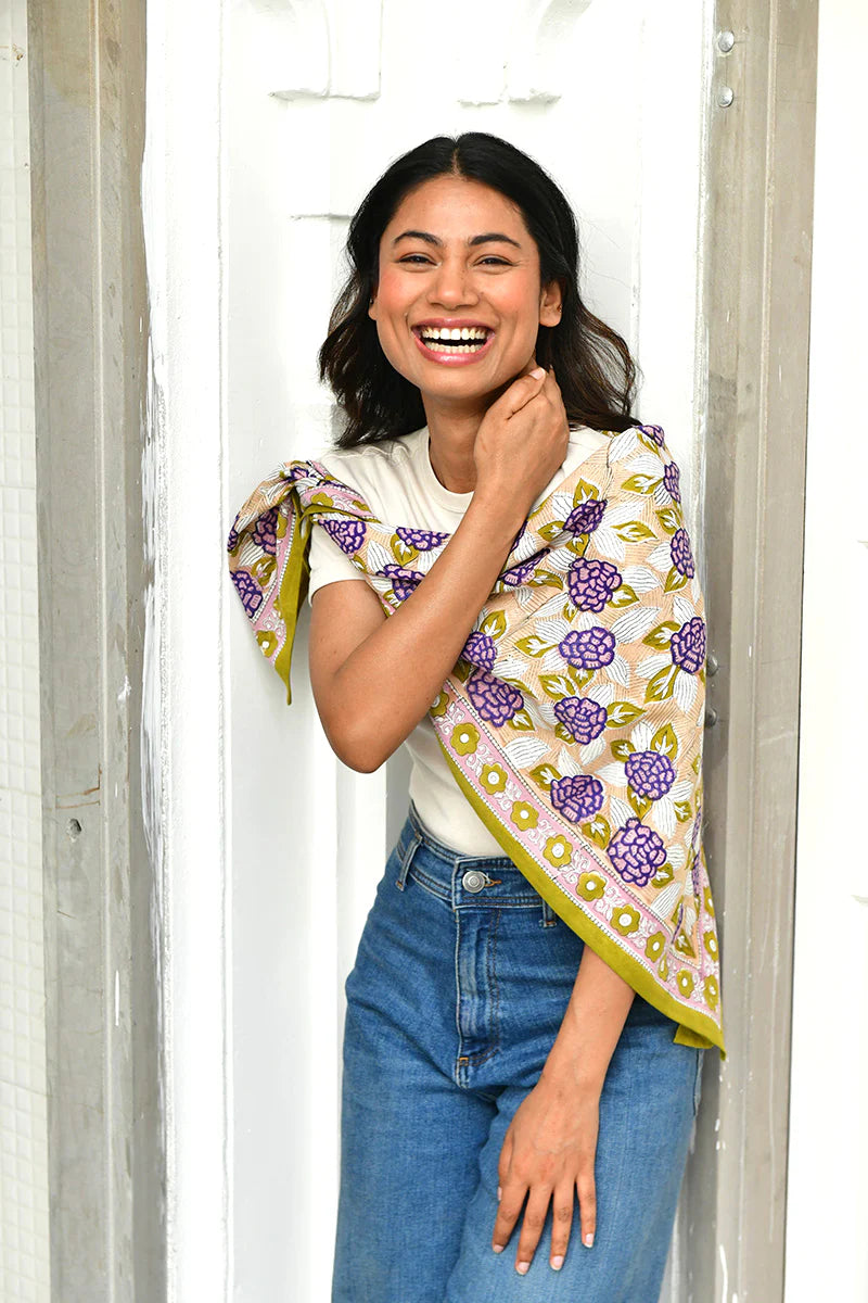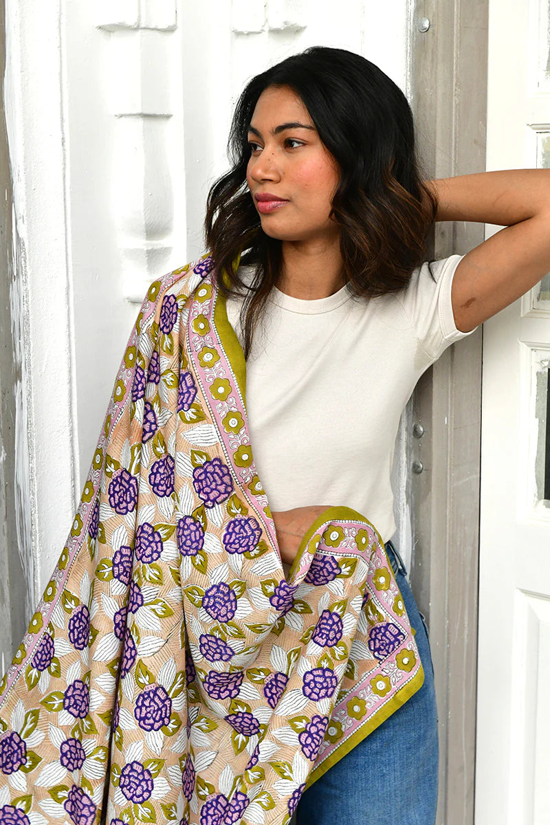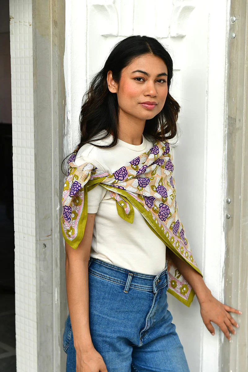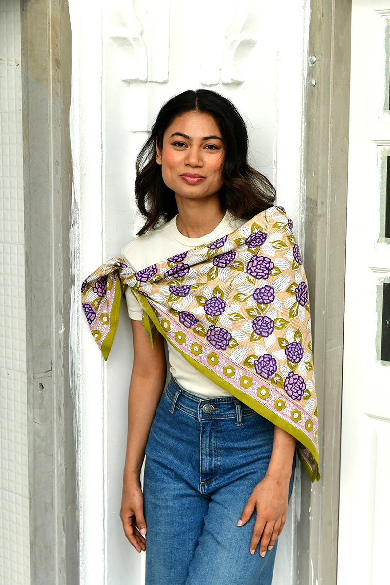 Cet foulard a été imprimé de manière artisanale selon la technique d'impression blockprint et confectionné à Jaipur en Inde. Les couleurs sont réalisées à partir de pigments naturels.