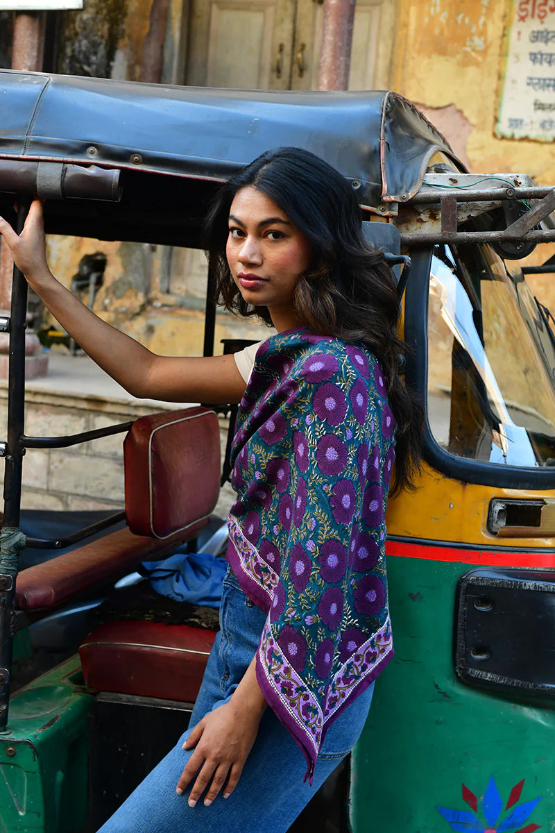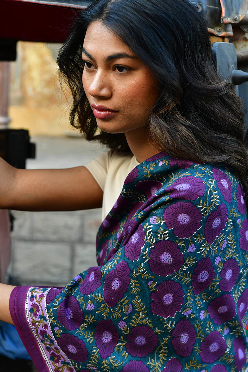 Cet foulard a été imprimé de manière artisanale selon la technique d'impression blockprint et confectionné à Jaipur en Inde. Les couleurs sont réalisées à partir de pigments naturels.