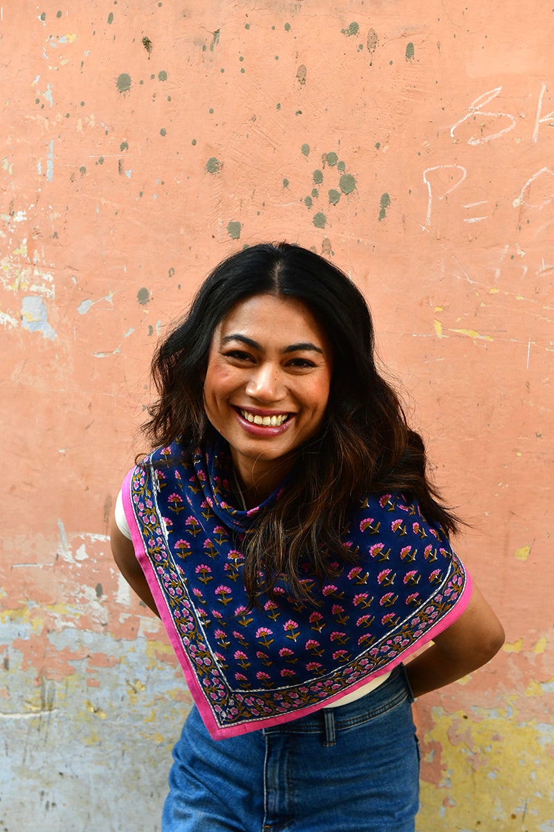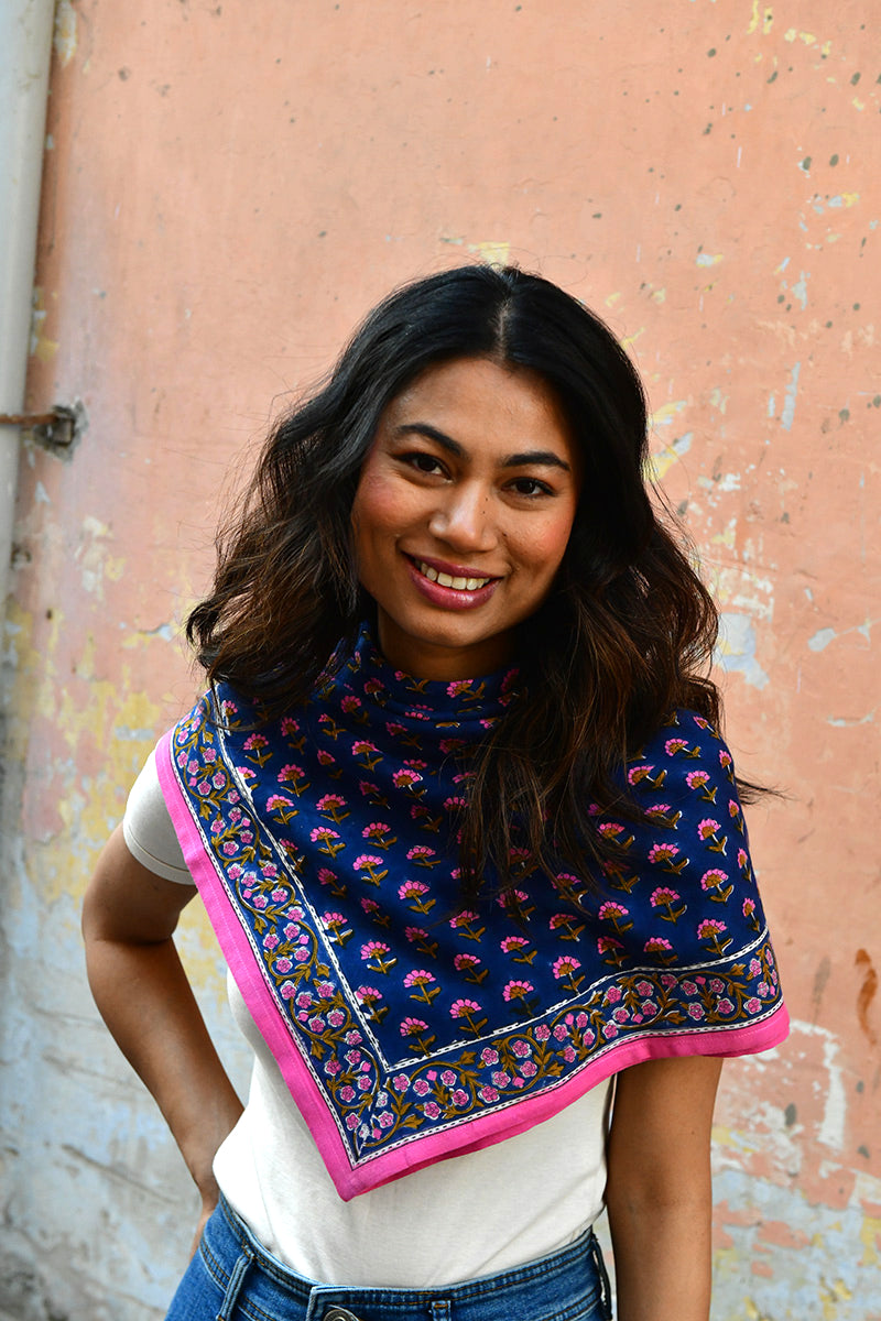 Cet foulard a été imprimé de manière artisanale selon la technique d'impression blockprint et confectionné à Jaipur en Inde. Les couleurs sont réalisées à partir de pigments naturels.