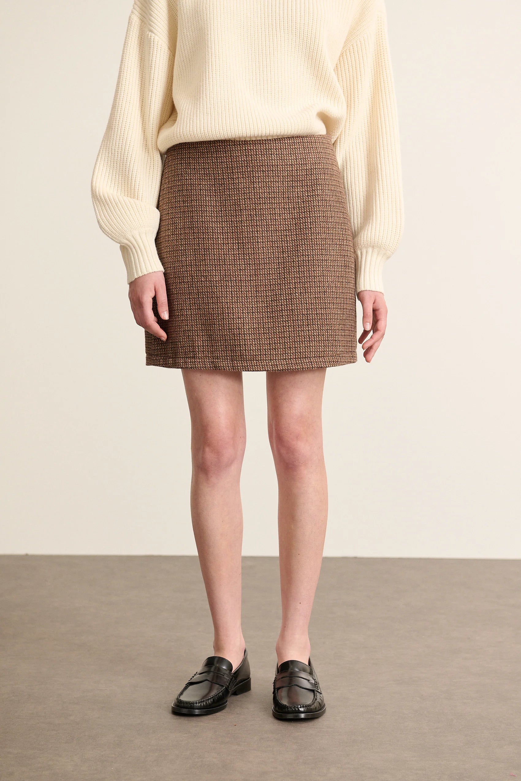 BOWEN est une mini-jupe en pied-de-poule, doublée et dotée d’une fermeture éclair au dos pour une silhouette nette et structurée. À la croisée du rétro et du contemporain, elle se porte aussi bien avec un pull en maille qu’une veste assortie ajustée. Un essentiel féminin, qui traverse les saisons avec allure.