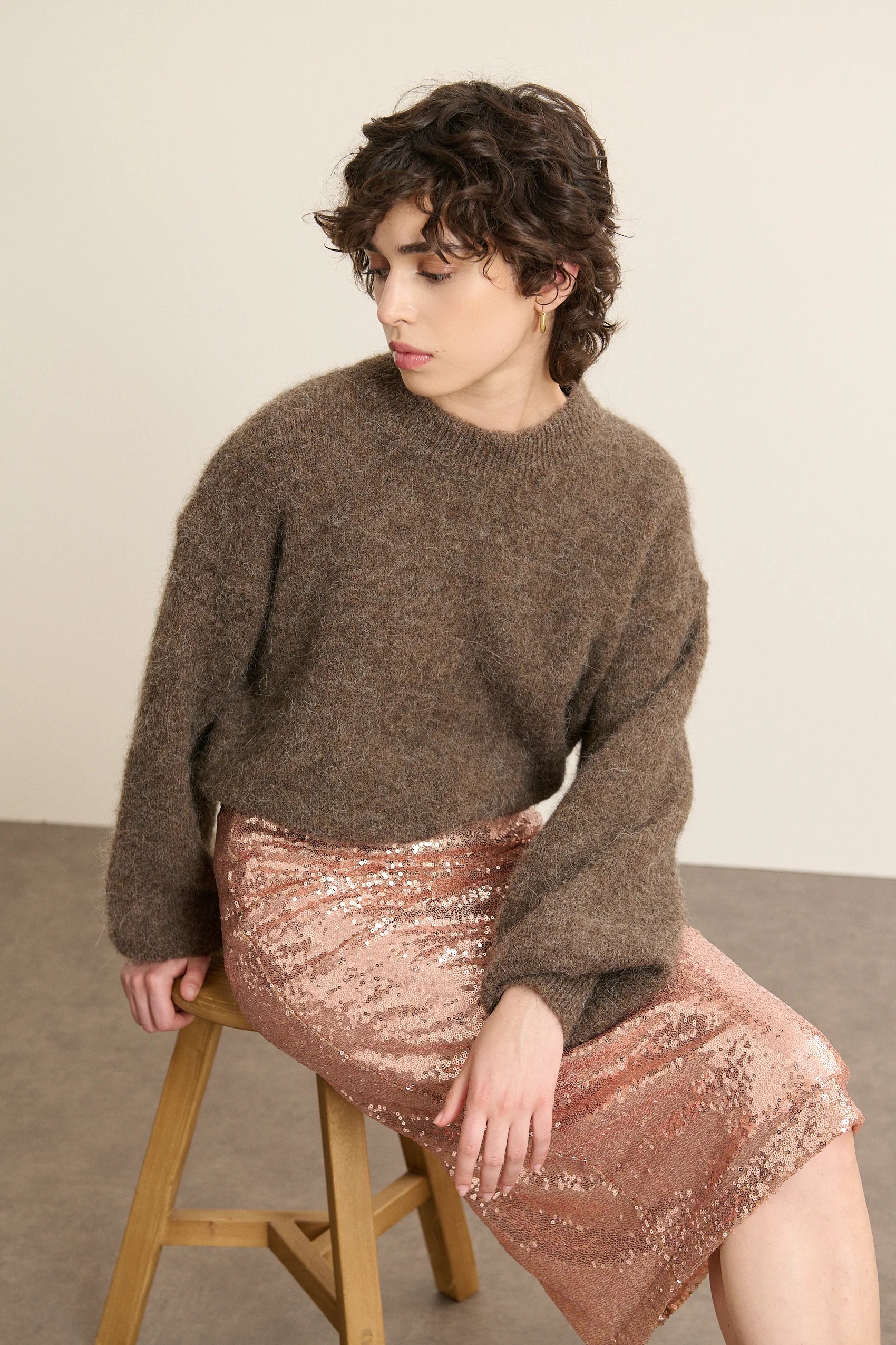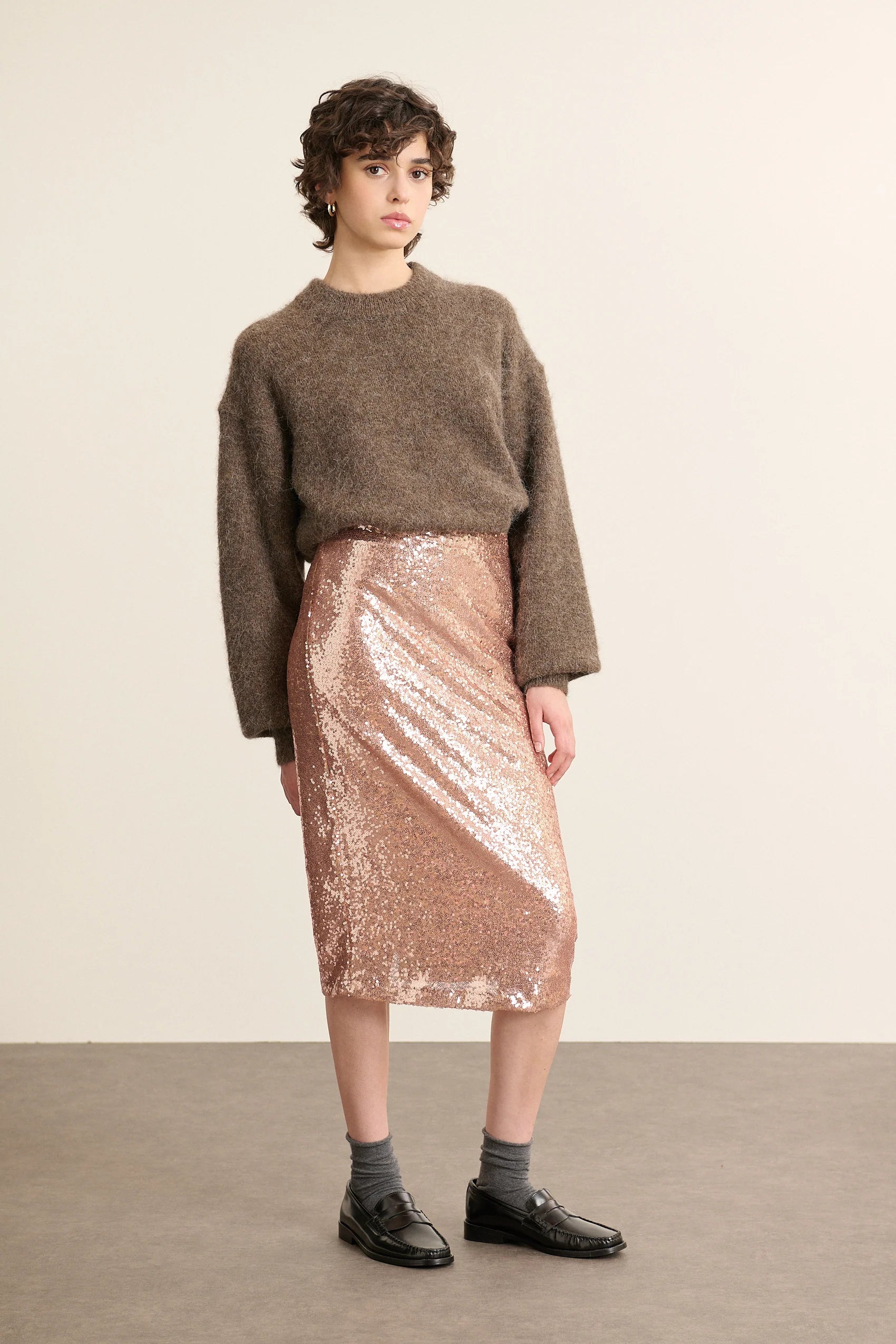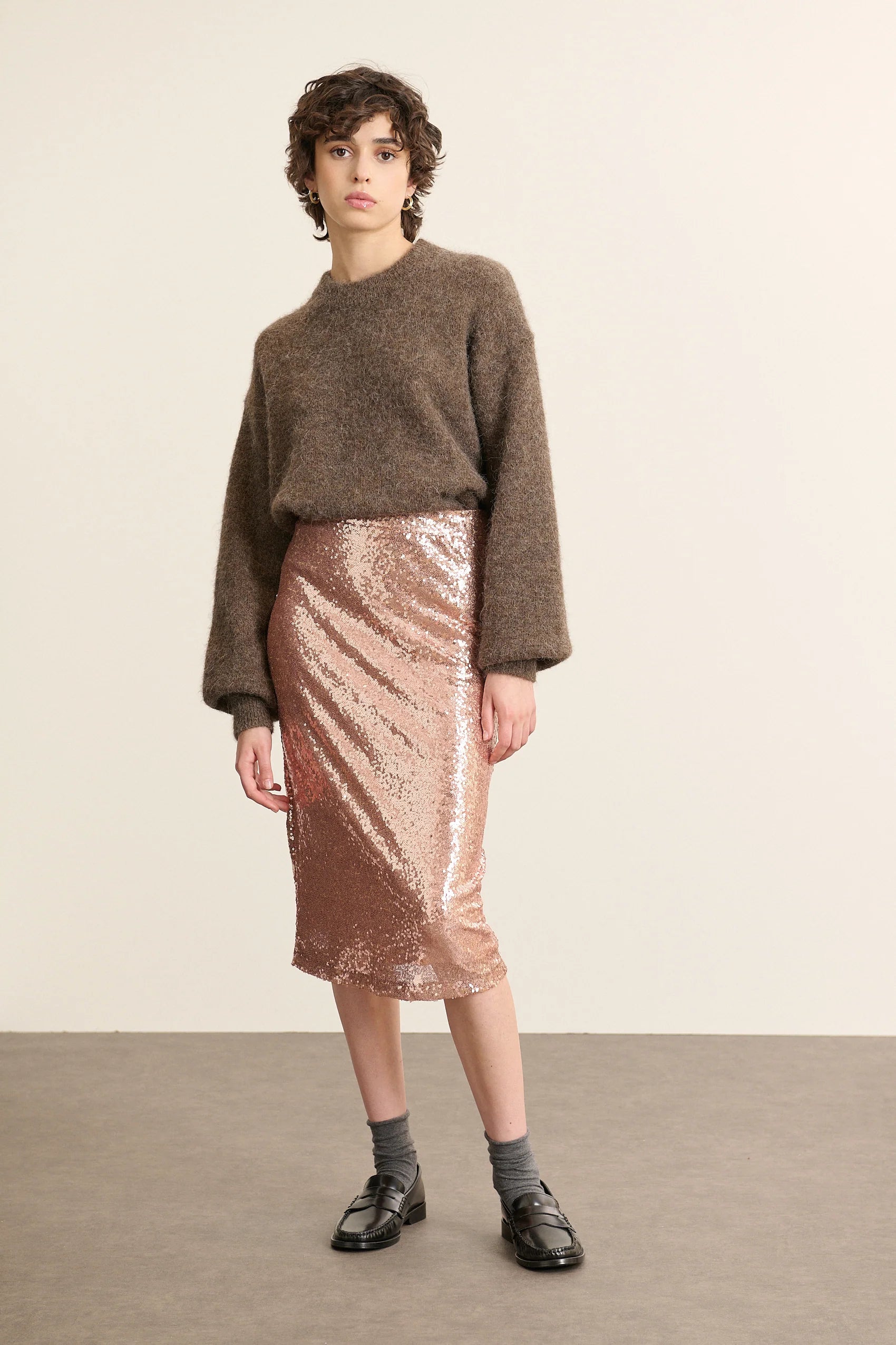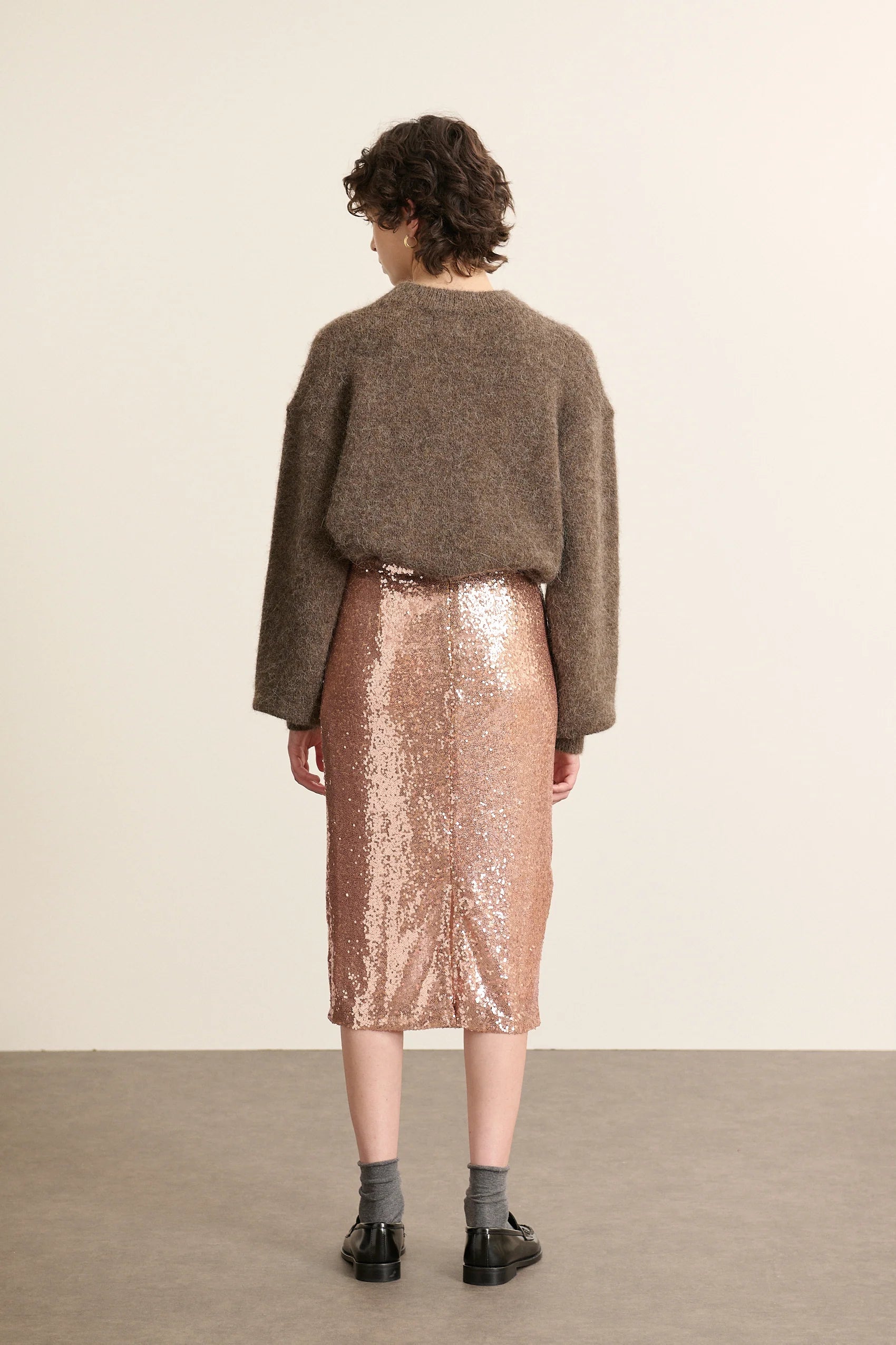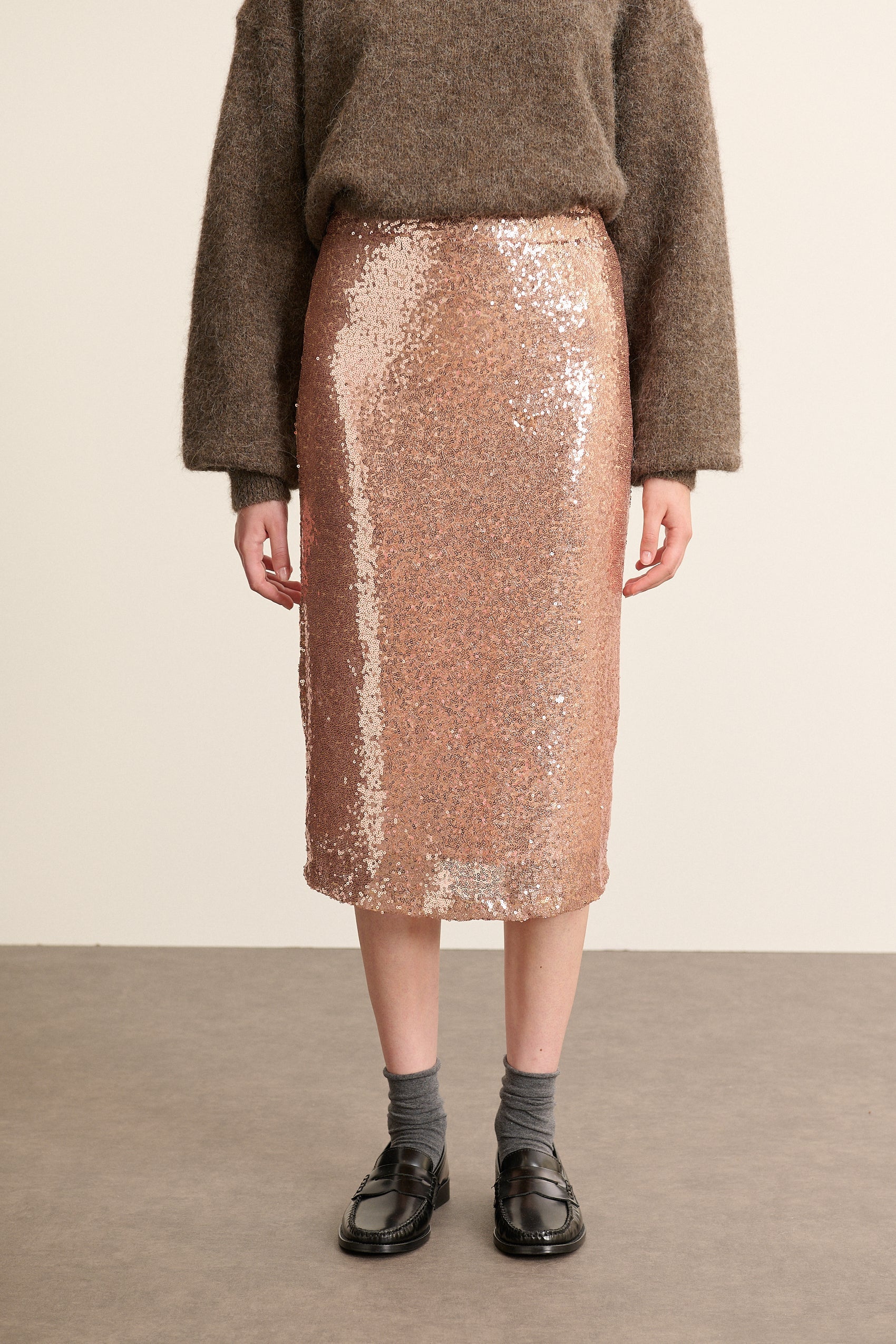 TOPAZE est la jupe droite à la longueur midi idéale pour la saison. Recouverte de sequins au coloris champagne, elle reflète la lumière à chacun de vos mouvements. Avec sa doublure intérieure, elle vous offrira un grand confort et se ferme par une fermeture éclair discrète et un crochet au dos. Osez la porter avec un pull fluffy pour une allure décalée ou avec un top éblouissant pour les soirs de festivités !