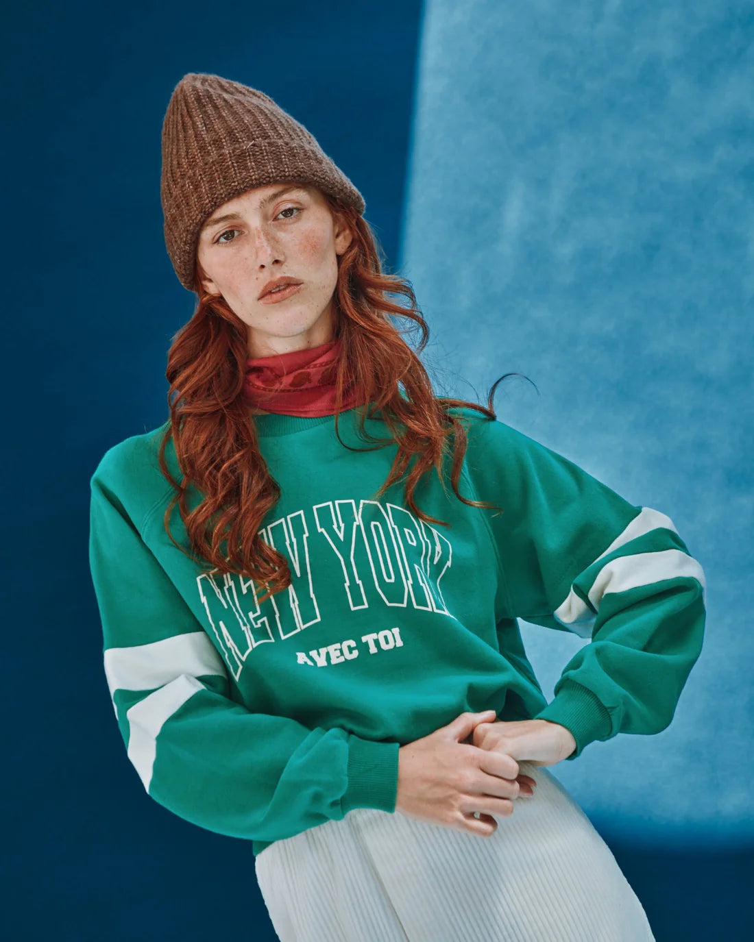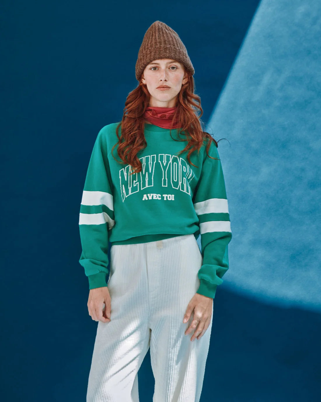Sweatshirt court en jersey de coton biologique molletonné vert imprimé sur le devant " New York avec toi ".