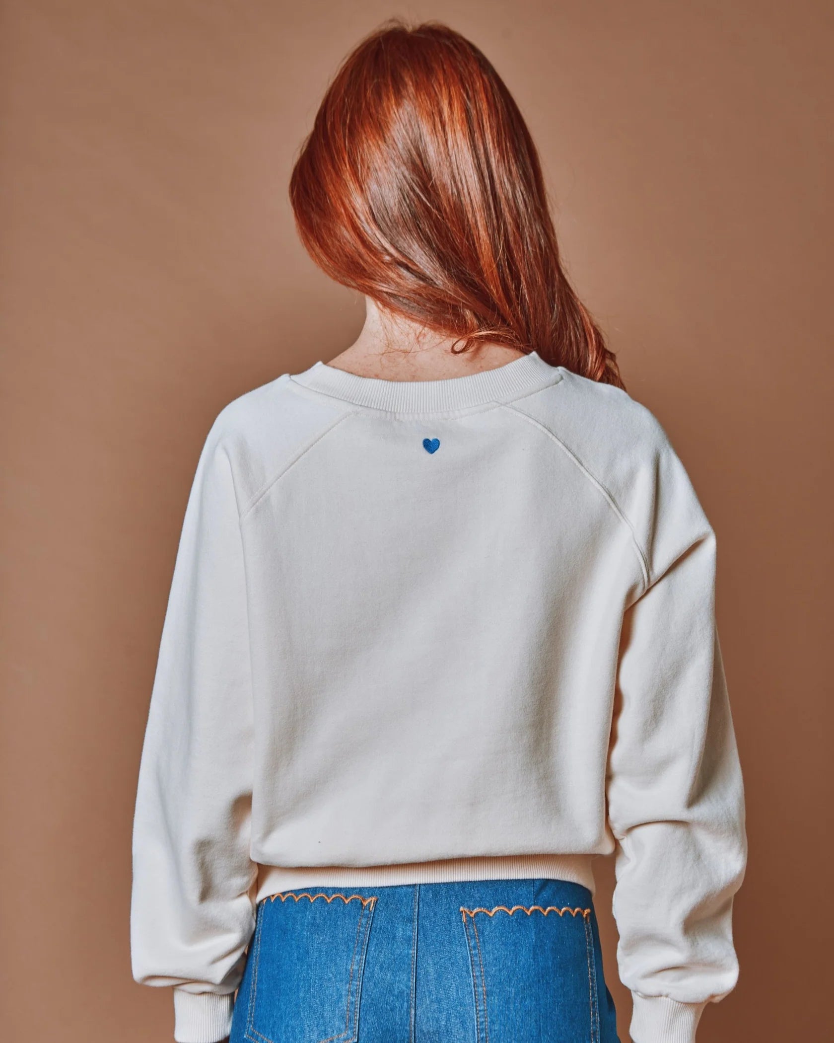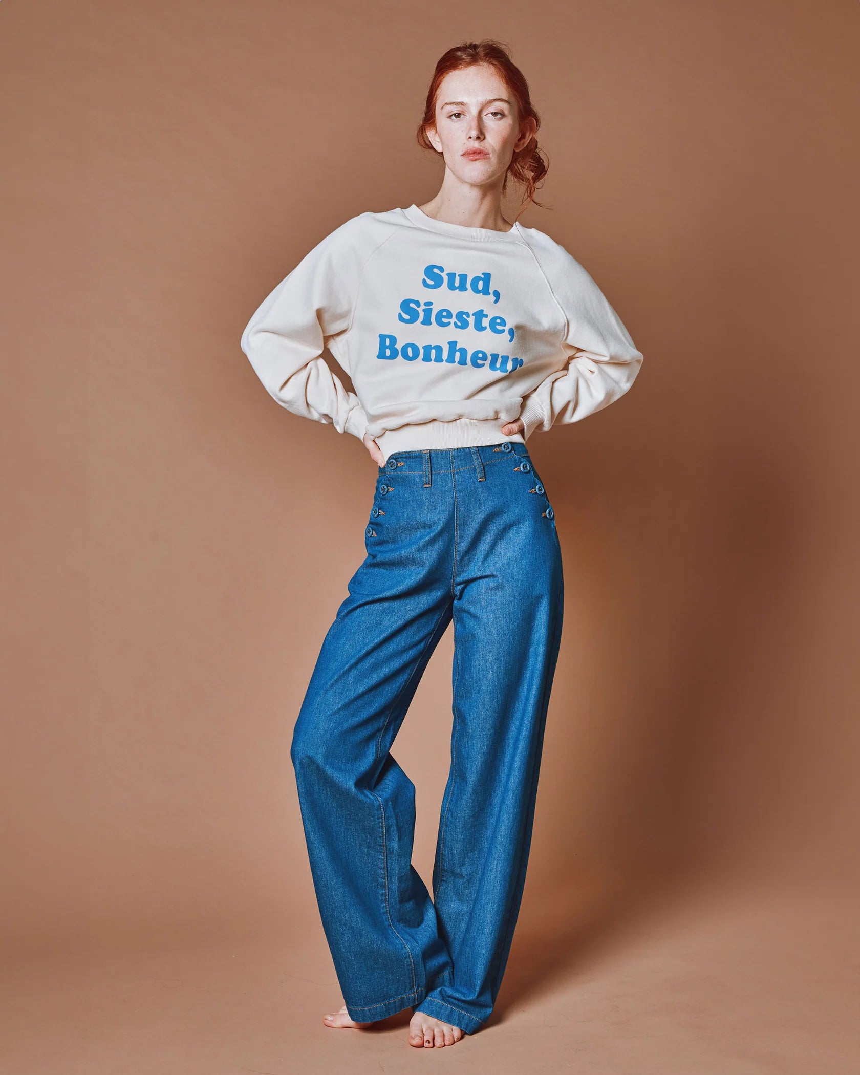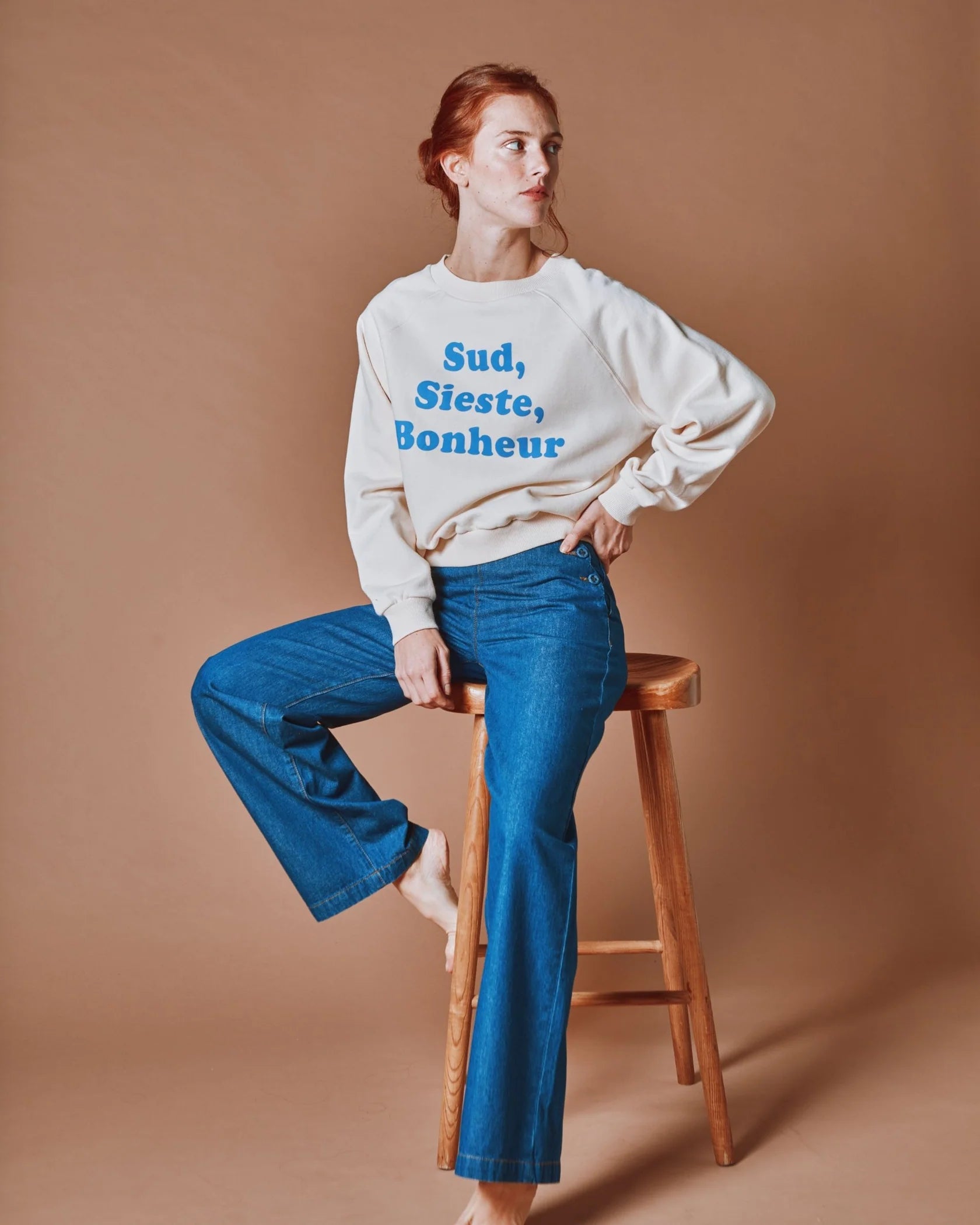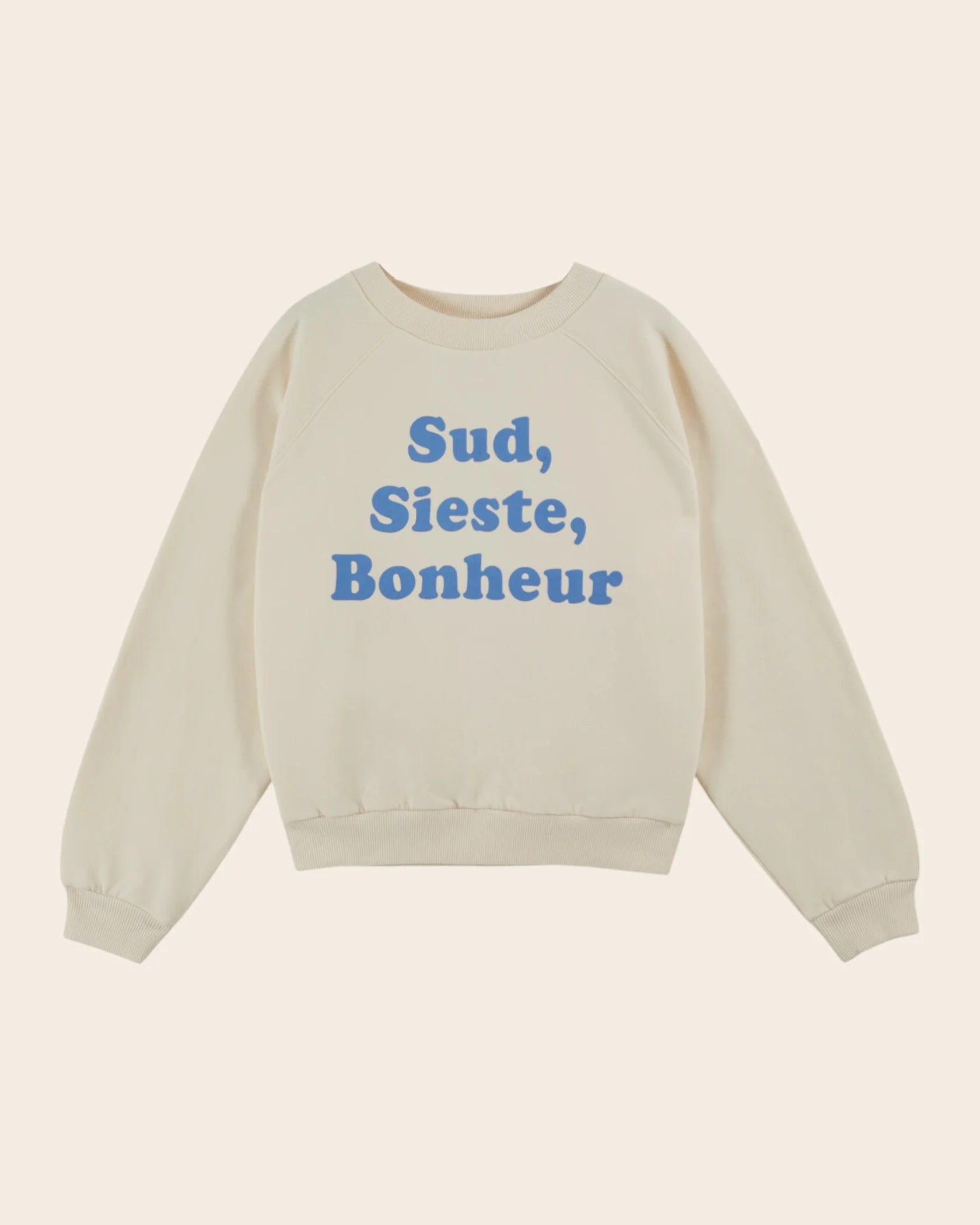 Sweatshirt court en jersey de coton bio molletonné crème imprimé sur le devant "Sud, Sieste, Bonheur" en bleu.
